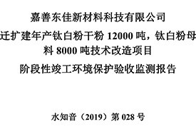 公?? 示??? 根據《國務院關于修改〈建設項目竣工環境保護管理條例〉的決定》(國務院令第682號),以及環保部《關于發布的公告》(國環規環評[2017]4號),現將嘉善東佳新材料科技有限公司遷擴建年產鈦白粉干粉12000噸,鈦白粉母料8000噸技術改造項目階段性竣工環境保護